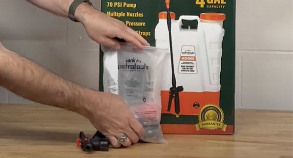Assemble your HD4000 Battery-Powered Backpack Sprayer. Thread the valve handle onto the hose. Thread the wand onto the valve handle. Then select the nozzle of your choice.