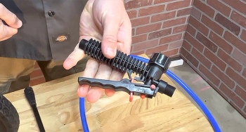 Attach the 2-ft hose to the reel and the other end to the bottom of the tank. Use the provided Teflon tape to prevent leaks.